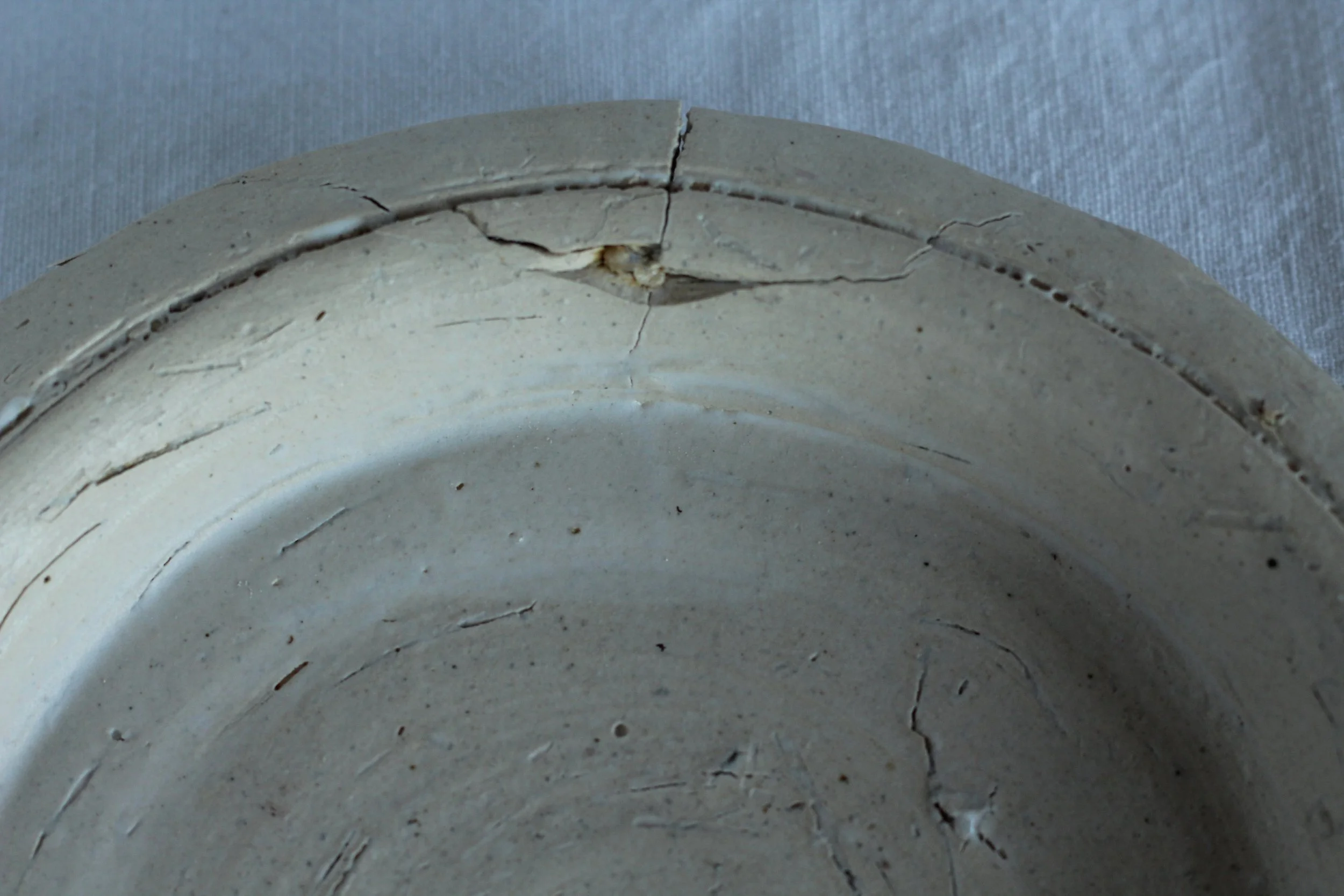 Posteriorment, bescuitada a 900° i esmaltada a 1250° amb esmalt blanc mate d'alta temperatura que contrasta amb els relleus que el fem havia deixat i el foc havia segellat.