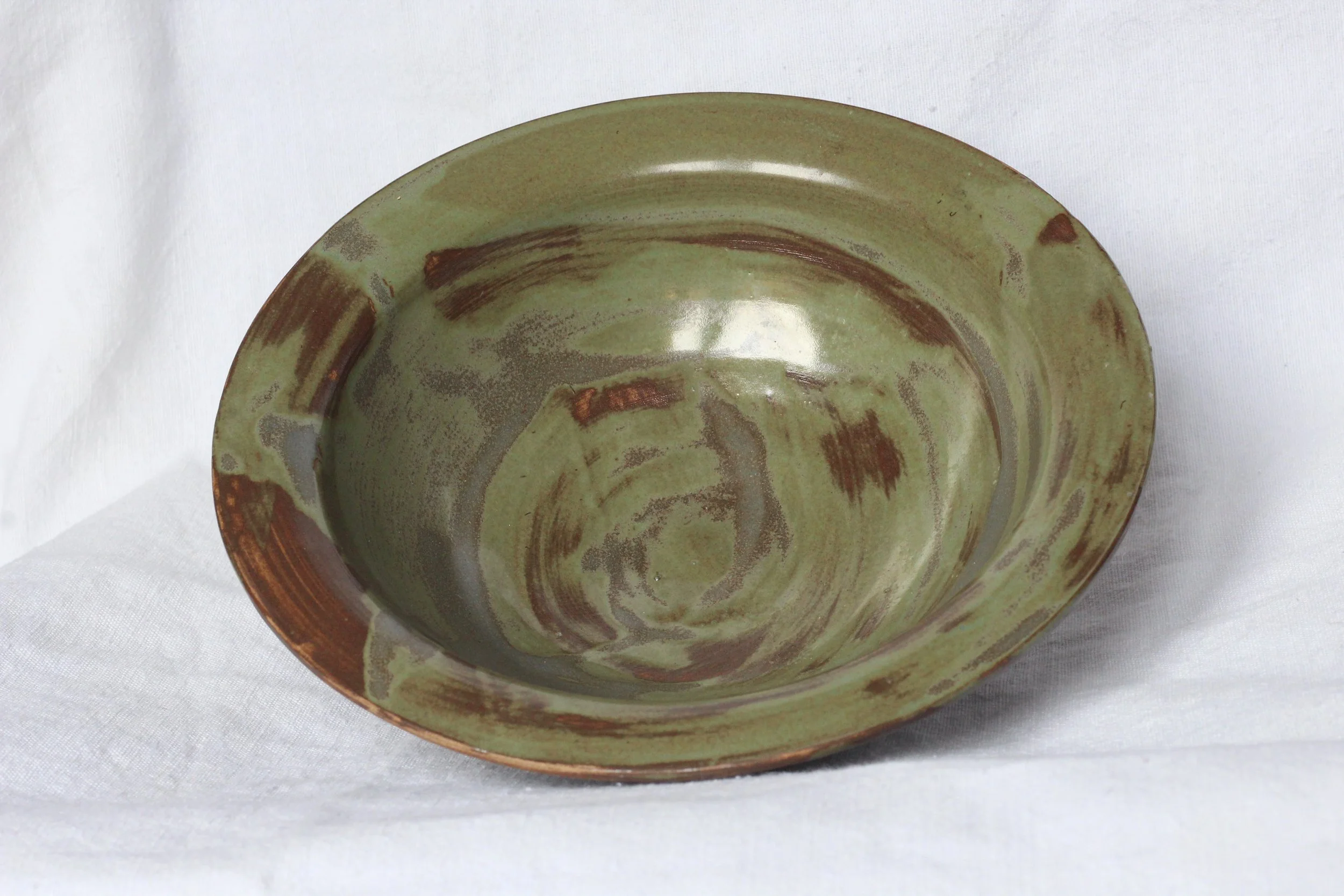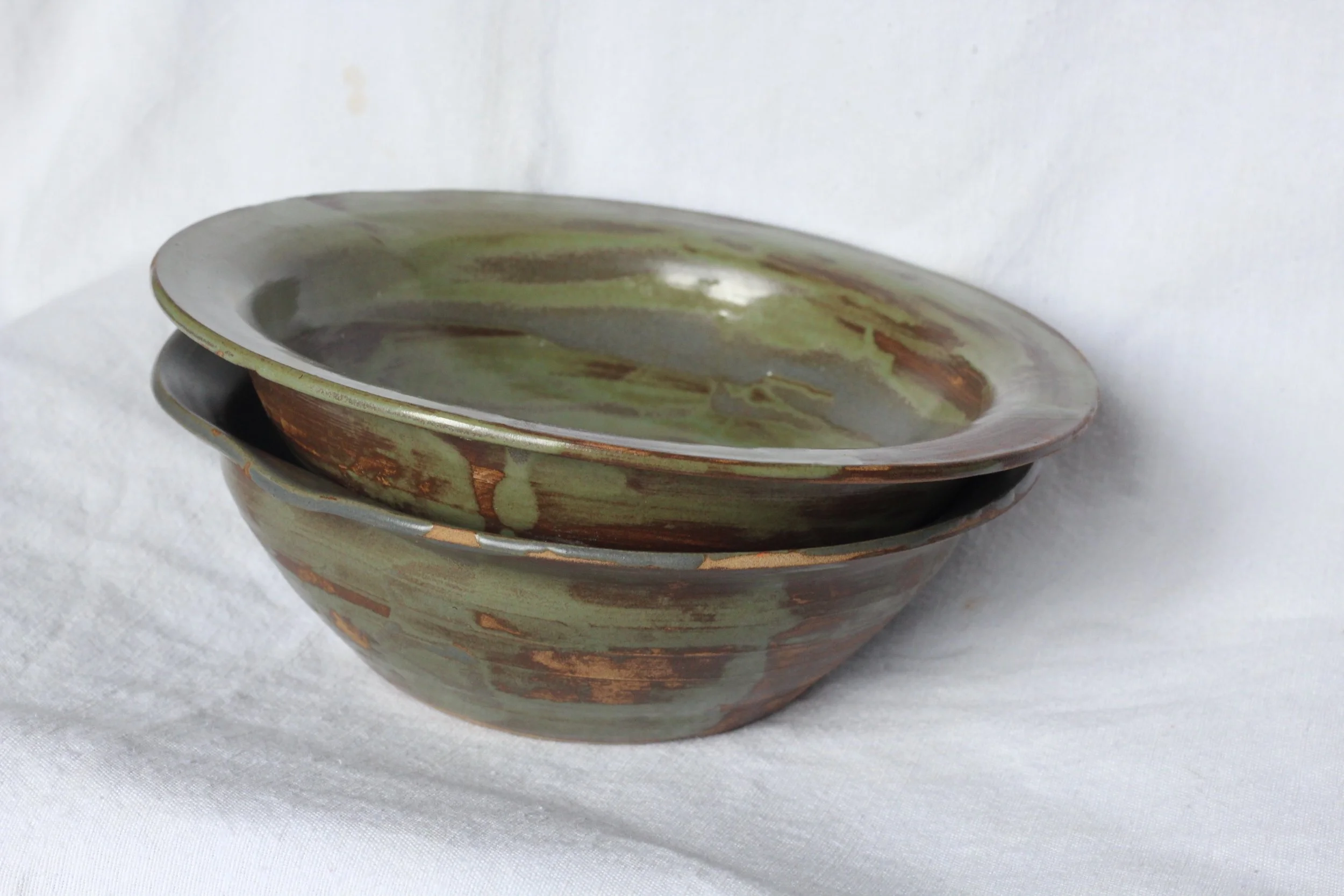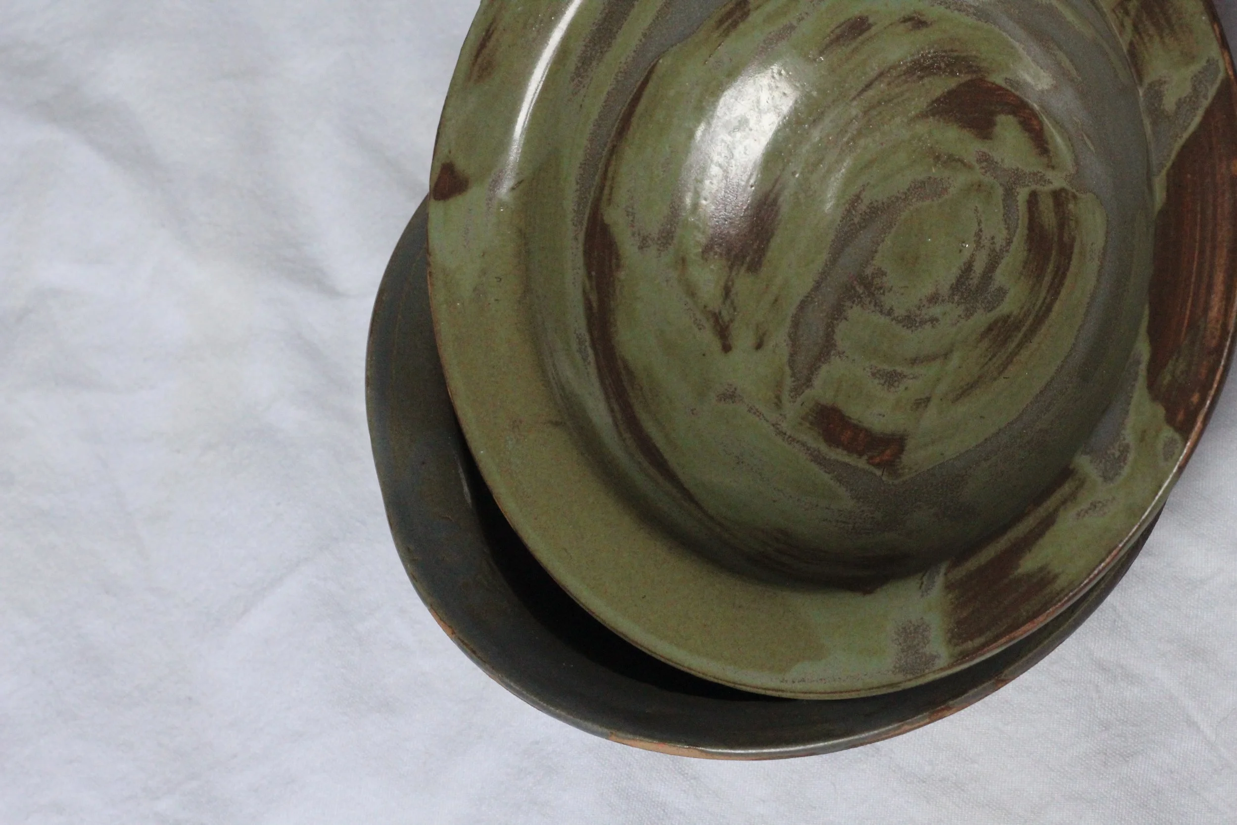 Parella de plats de ceràmica d’alta temperatura, esmaltats en una gamma de verds que ressalta la profunditat i la textura de les superfícies.
